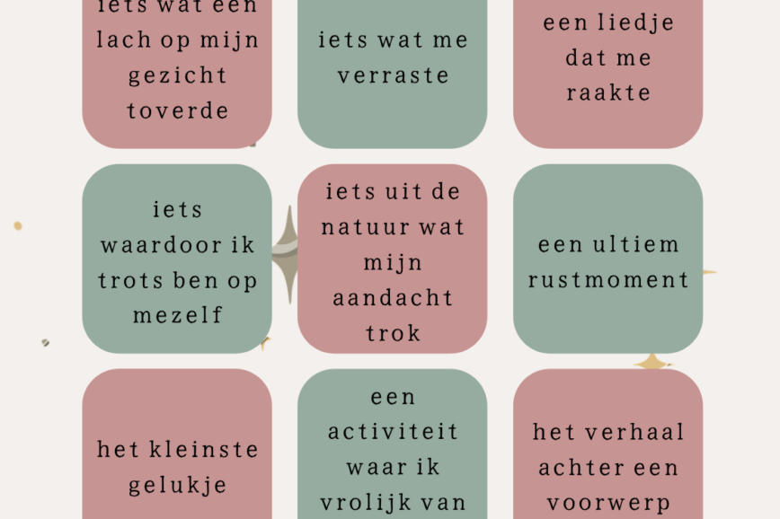 Linda had een idee! Wat als we met ons drieën (Irene, Linda en ik) rond dezelfde thema’s zouden schrijven? En wat als we dat zouden combineren met het spel bingo? Elk vakje staat voor een woord, een liedje of een gevoel dat we meemaken en waar we iets over schrijven. Het gaat daarbij bewust over…
