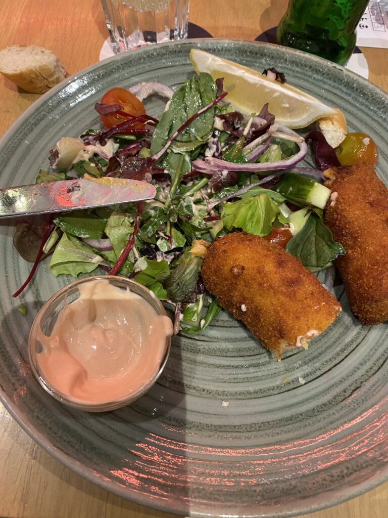 ’s Middags gaan we op de hoek van de winkelstraten iets eten. Sommige kiezen iets warm, iemand anders kiest een salade. Ik ga voor garnaalkroketten omdat het iets is wat ik thuis bijna nooit zelf klaar maak. Het is een bordje met bloemkoolrijst en granaatappels. De rijst moet ik wel gaan zoeken tussen mijn sla maar het is wel lekker.