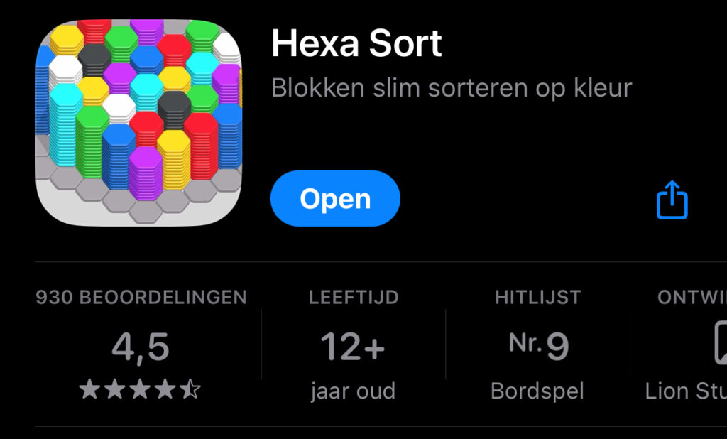 Ik ben verslaafd aan een nieuw spel op de telefoon. Ik hou er van om soms eens nieuwe (gratis) spelletjes uit te testen. De reclame ertussen is wel vervelend. Hexa Sort lijkt een beetje op Candy Crush maar dan in 3D. Je moet stapeltjes maken met gekleurde blokken. De blokjes lijken op schijven. Alle blauwe komen op elkaar, alle rode enzovoort. Is je stapel groot genoeg dan verdwijnt het. Geen reclame, gewoon om te delen