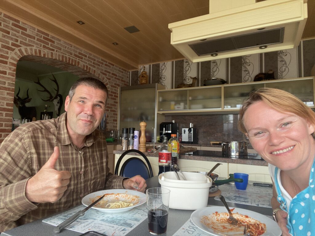 He’s back! Manlief is terug thuis van zijn jachtvakantie. Lekker bruin, niet moeilijk na een week in 40 graden 😱. Na zijn kledij en materiaal uit te laden is het tijd om pasta te eten na al die barbecue en pizza. Je ziet hem genieten van zijn tweede bord terwijl ik nog aan mijn eerste bezig ben 🥱. Dat is steeds eentje zonder saus. Zouden de Italianen dat ook zo doen? Zijn siësta zal hem deugd doen na een hele nacht rijden.