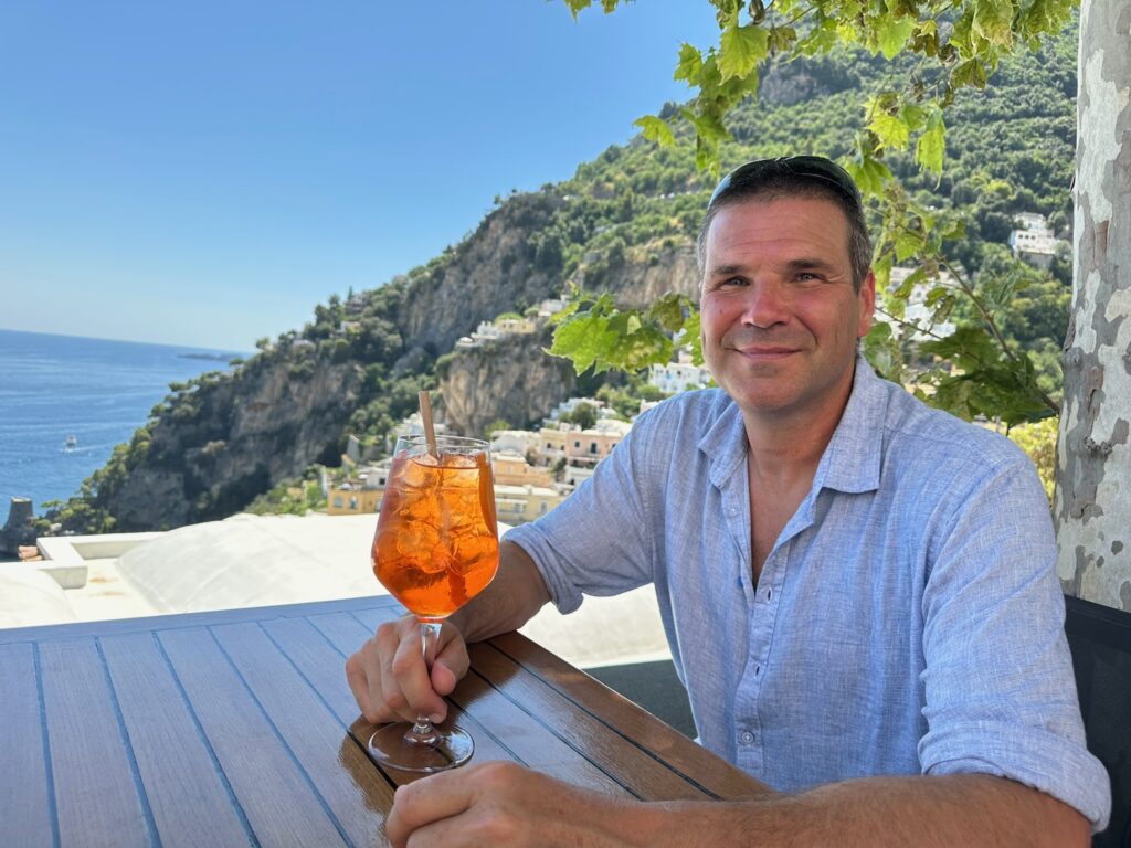 Daar heb ik nogmaals een bevestiging gekregen dat ik geen fysiek heb. Vergeet ook je niet in te beelden dat dit allemaal in temperaturen van 35 graden of meer is. We hebben op het einde van de dag 65 niveaus gedaan volgens mijn horloge. Het is geen stad om met kleine kinderen of met een buggy te bezichtigen ondanks dat er mooie winkels zijn. Soms ook dure! De meisjes willen een souvenir als herinnering. L. kiest een klip voor in haar haar en een ketting. A. koopt voor iemand anders iets. We nemen een glaasje met citroenen en de tekst Positano mee. Aangezien de auto helemaal bovenaan staat, moeten we de trappen terug naar omhoog nemen om dan met de wagen helemaal naar beneden te rijden. Grappig, vind ik het niet. Gelukkig nemen we boven een welverdiend drankje met uitzicht op de stad.