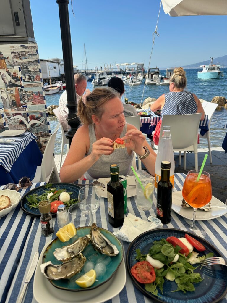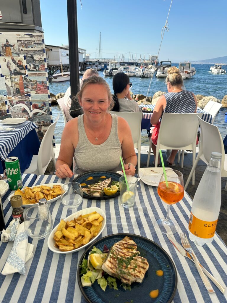 Na Positano rijden we naar Sorrento. De streek van de citroenen en Limoncello. Jammer genoeg zijn we te laat, want ze hangen niet aan de bomen. Het moet mooi zijn om alles in het geel te zien. In het midden van de stad is een parking. Je geeft je sleutel af en zij parkeren je auto god weet waar. Er is een betalende lift naar het centrum. Doordat ik een verkeerd bord volg, komen we bij trappen naar boven uit. Geen goed idee in hete temperaturen en als je sandalen met een lederen zool draagt. Ik loop meer op mijn tenen dan op mijn sandalen. Gelukkig ondersteunen K. in het opgaan en A. mij in de terugweg. Ik had goede reviews gelezen bij een restaurant aan de zee. Porto Marina restaurant heet het. Specialiteit vis, gelegen op de kaai en zicht op zee.
