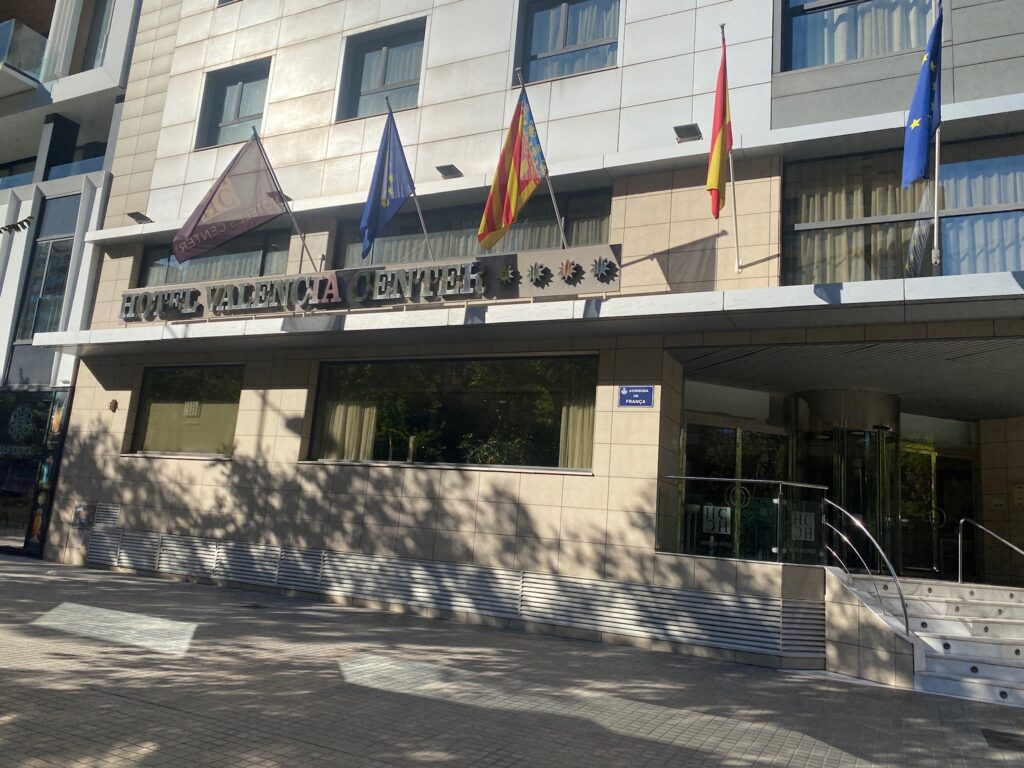 We moeten niet lang wachten op onze bagage. Aangezien ik de vlucht en het hotel apart geboekt heb, zit er geen transfer in. We gaan op zoek naar een taxi bij het verlaten van de luchthaven. De taxi’s staan links als je uit het gebouw komt. We proberen in ons beste Spaans uit te leggen dat we naar Hotel Valencia Center willen. De chauffeur herhaalt 3 tot 4 keer de naam. Het leek wel of hij ons niet verstand dus we zeggen iedere keer ‘Si’ maar hij was tegen zijn navigatie aan het praten. hahaha! Ik word zenuwachtig als ik de cijfers van zijn teller telkens zie omhoog gaan. Ik dacht dat we moesten betalen per kilometer maar ook al we niet bewegen blijven de cijfers verder springen. Ondanks dat het hotel niet ver van de luchthaven ligt (ongeveer 16 km) moeten we 23 euro betalen met een supplement van 5 euro. Goed we zijn er dan wel op 22 minuten.